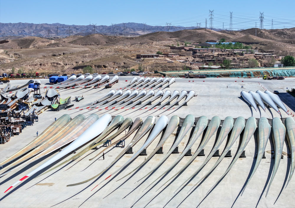 2024年5月11日拍摄的码放在内蒙古包头市石拐区一家风电设备制造企业厂区内的叶片(无人机照片)。